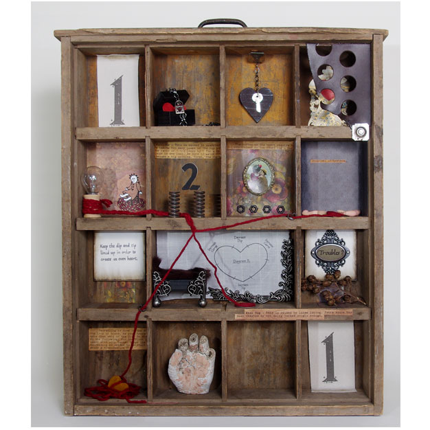 This piece is highly personal and speaks to the building and subsequent loss of relationship. The motif running throughout is of the making of a rag rug. A variety of mixed media and found objects and used in this artwork.