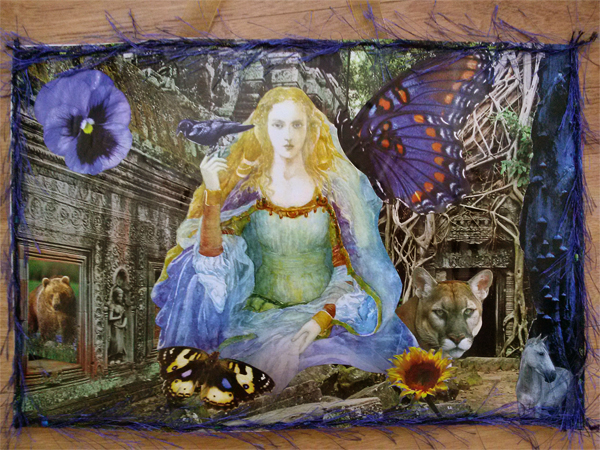 I had no idea what it was going to be. My friend and her daughter were visiting from out of town and along with my stepdaughter who is seven, we needed a fun project to do in my new home studio. Voila! Collages- easy and fun! I have tons of scraps saved up over about 20 years of collecting. With the right glue- repositionable paste- and a mountain of stuff to sift through, we spent about 2 hours making some fun creations! I found a central image that really spoke to me- that caught in my hand. A floating goddess woman who seemed to be holding something in her raised hand. Then I found a striking background image. My process proceeds in a way that is similar to playing- opening myself up to creativity- to trying something, then something else, accepting and rejecting as I go along. I think of it as listening to my muse. It involves being discerning and allowing myself time to play.